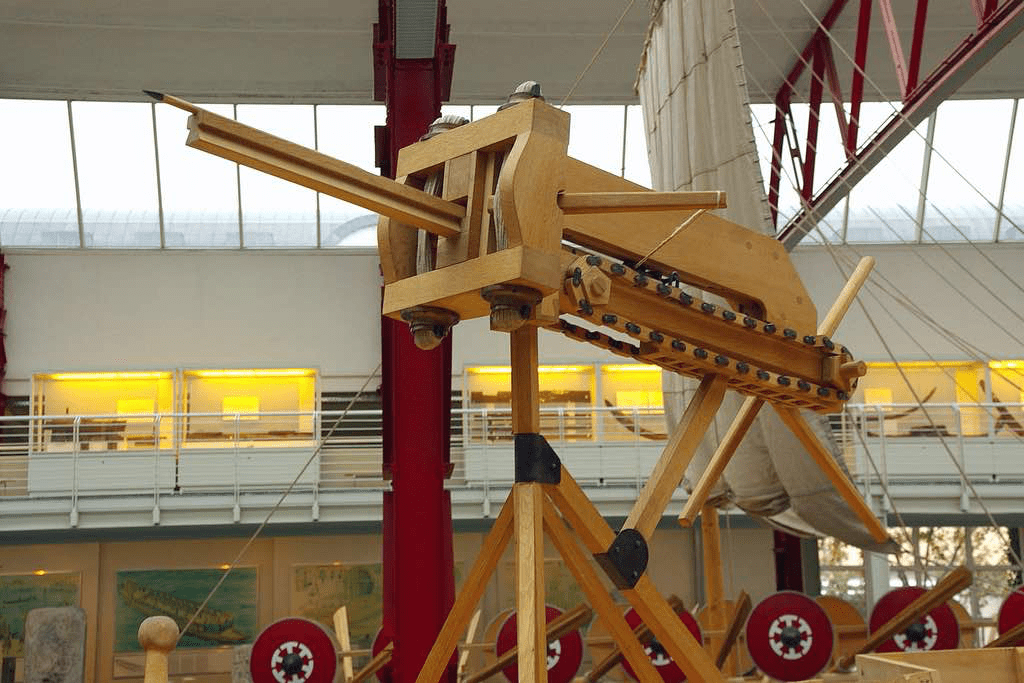 The Greeks used ‘arrow-shooting machines’ from the mid-fourth century BC onward. Aeneas Tacticus mentions their use in his treatise on siegecraft written around 350 BC, and Athens’ Arsenal is recorded as having a number of catapults in store capable of shooting bolts of varying size by using animal sinews as springs.