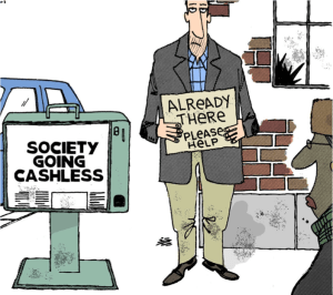 Moreover, there are some clear downsides to a cashless world. First, it will alienate a lot of people and put them on the fringe of society, if not make them outlaws. Not everyone has a smartphone, a bank account or even a permanent address.